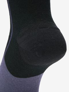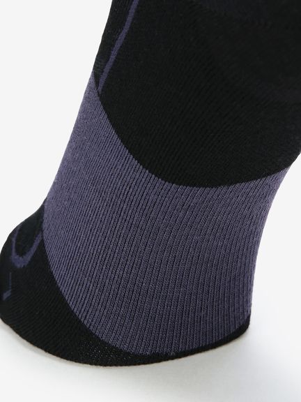 生地は、メリノウールにナイロンやポリウレタンを混紡し、強度と伸縮性を高めています。部位により編み組織を変えることで、それぞれに必要とされる機能を確保。甲は、通気性のあるメッシュ構造に。擦れやすいかかととつま先部分は補強し、インステップサポートでフィット性を向上させています。左右非対称のオブリークタイプです。