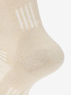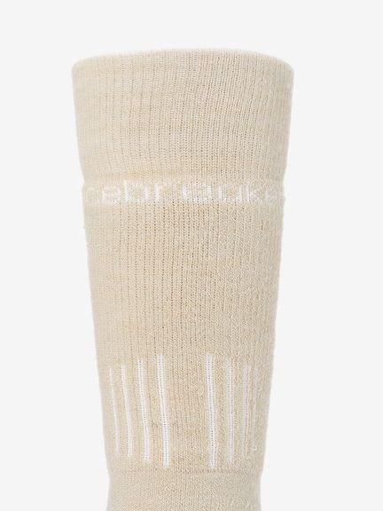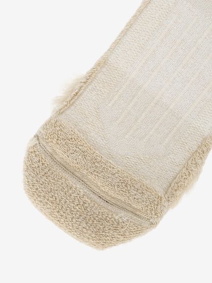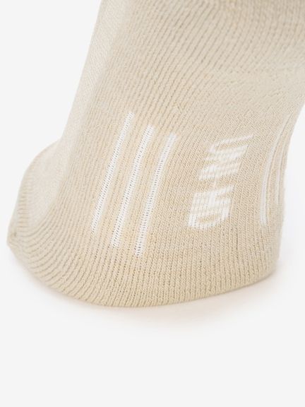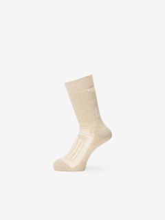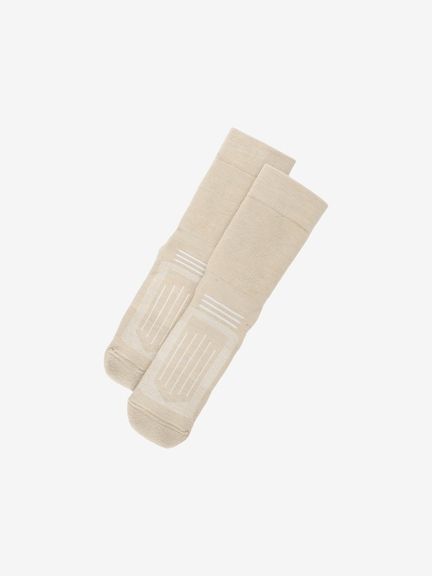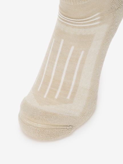 メリノウールにナイロンとポリウレタンを混紡し、摩耗などに対する強度と伸縮性を高めた生地を使用。さらに、部位により編組織を変えることで、快適性が向上。レッグ部分とボトム部分にクッション性がある裏パイルを採用しており、衝撃を吸収し、足の負担を軽減。甲部分は薄手の生地で通気性を確保しています。