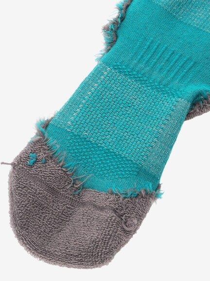 さらに、部位により編組織を変えることで、快適性が向上。ボトム部分とかかとにクッション性がある裏パイルを採用しており、衝撃を吸収し、足の負担を軽減。甲部分はメッシュ仕様で通気性を確保しています。