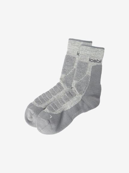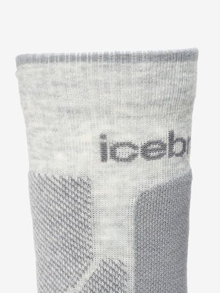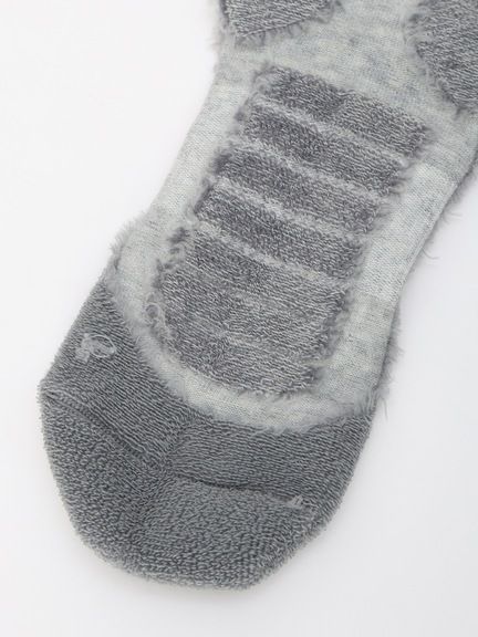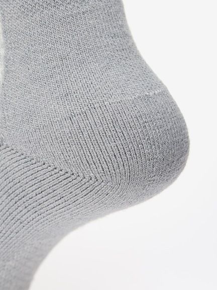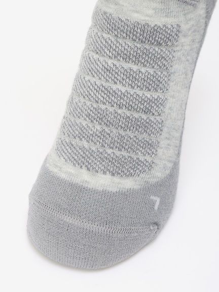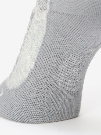 メリノウールにナイロンとライクラを混紡し、摩耗などに対する強度と伸縮性を高めた生地を使用。さらに、部位により素材を変えることで、快適性が向上。ボトム部分にのみクッション性がある裏パイルを採用することで、衝撃を吸収し、足の負担を軽減。甲部分は薄手の生地で通気性を確保しています。