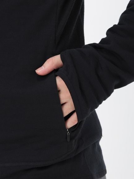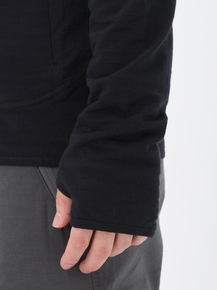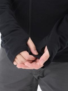 袖口は、手の甲まで覆えるサムループ仕様で、寒いときはミトンのように手先まで包み込めるデザインです。