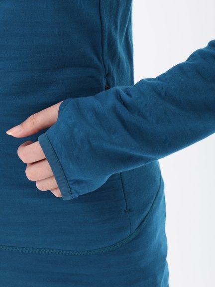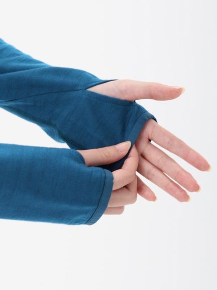 袖口は、手の甲まで覆えるサムループ仕様で、寒いときはミトンのように手先まで包み込めるデザインです。