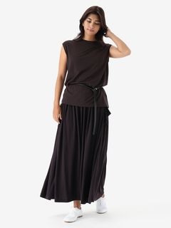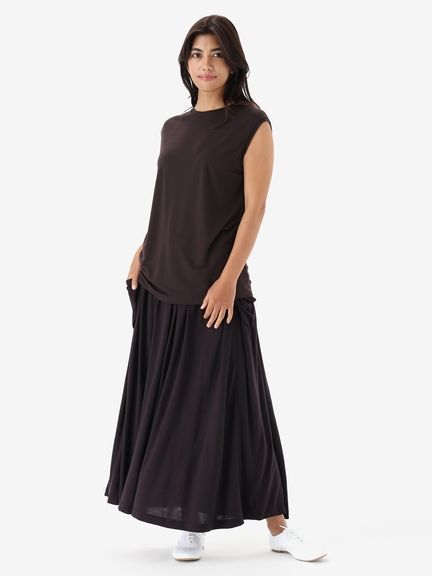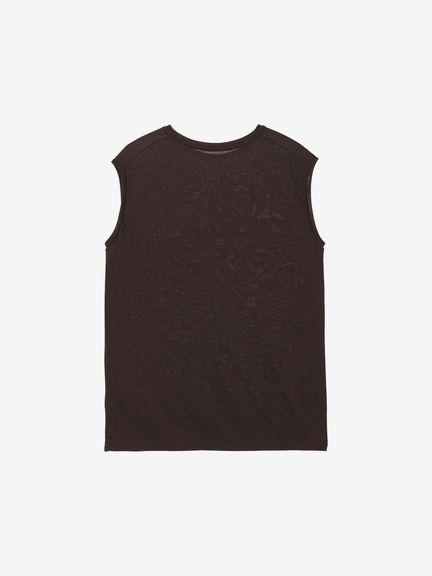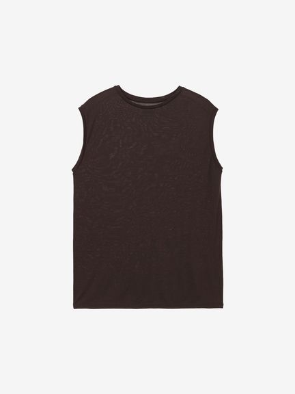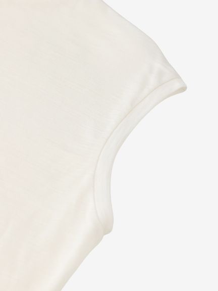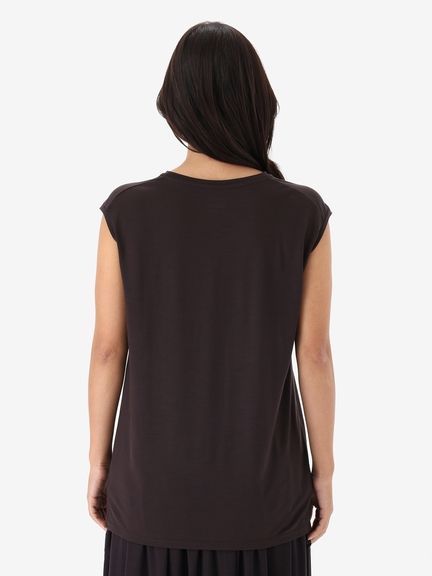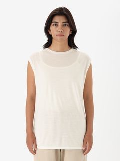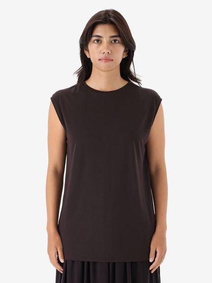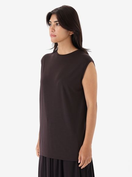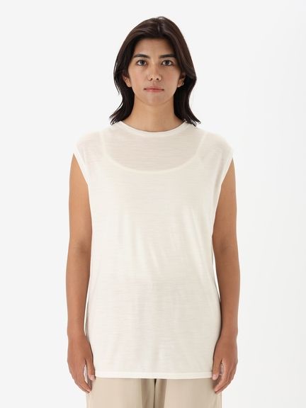 なめらかな風合いを生かしてドレープが効いた女性らしいスリーブレスシャツ。シンプルなデザインながら、首元を美しく見せるコンパクトなクルーネックデザインを採用し、やわらかい印象も演出しています。袖口も肌当たりがよく、心地よい着心地です。