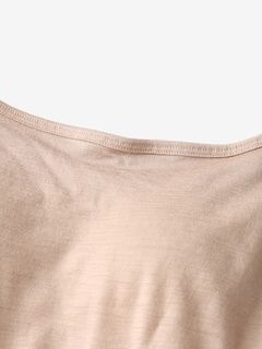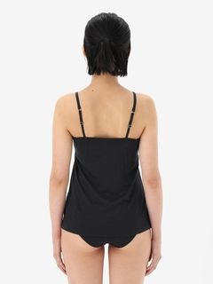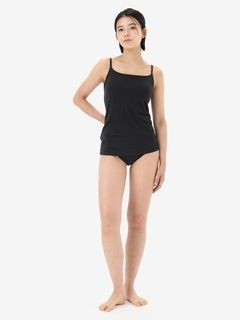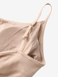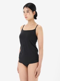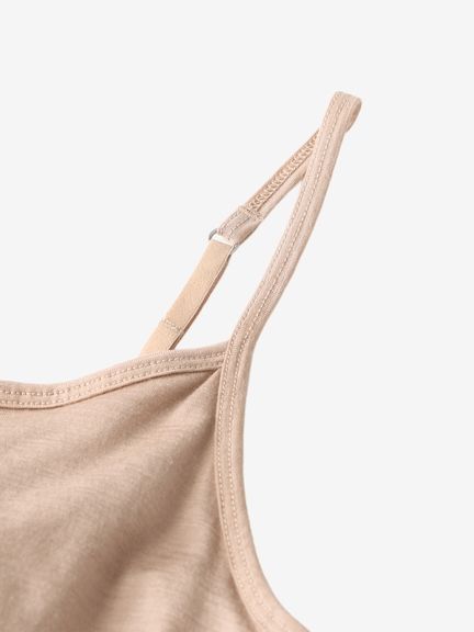 薄手の生地で、シーズンを問わず着用が可能。取り外しできるパッド付きのブラキャミタイプで、アンダーバストはゴムが肌に直接あたらない仕様で肌当たりがよく、やさしいフィット感が特徴です。胸元のラインは、カジュアルなストレートネックタイプ。