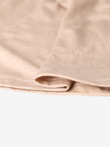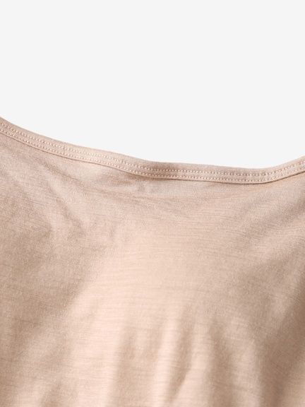 薄く軽やかなメリノウール100%生地。ウールがもつ断熱性と吸放湿性が、暑さや寒さをほどよく調えて、一年を通して心地よく過ごせます。汗冷えやにおいを軽減し、やわらかな肌触りで日常からアウトドアまで幅広く活躍します。