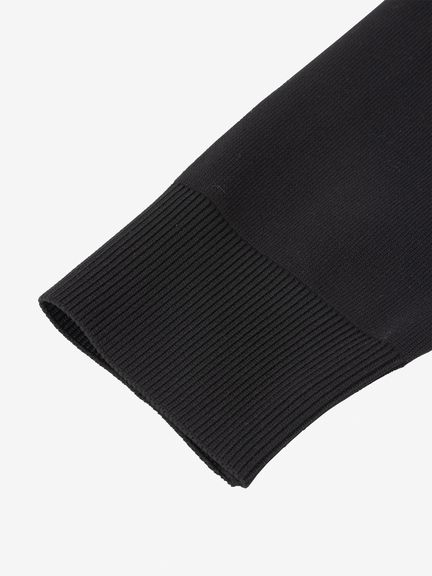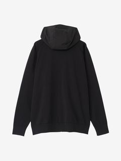 前身頃とフードは中わた入りの布帛を使用。表地は軽量メカニカルストレッチ素材で、身体の動きにスムーズに追従します。中わたには保温性と伸縮性のあるPRIMALOFT Active Ventを使用。後身頃と袖は、汗をかいても繊維の表面を弱酸性に保つ加工を施したポリエステルの糸をハイゲージで編み立てた、軽量のニット生地。腕の可動域が広く、肩に縫い目が干渉しにくいラグランスリーブを採用。熱がこもりやすい後身頃の背中中心部にはアイレットを配置し、衣服内のムレを軽減します。