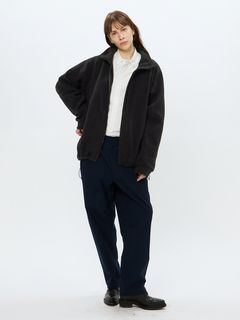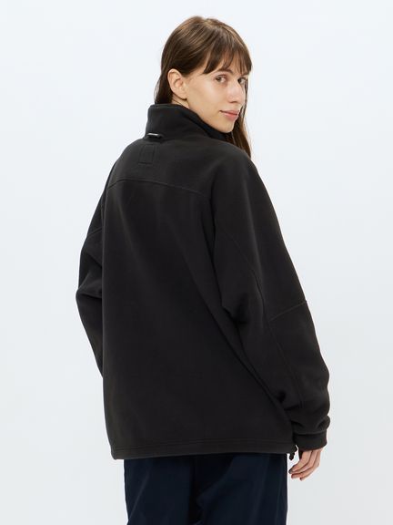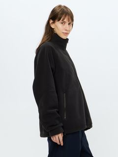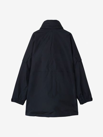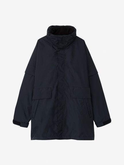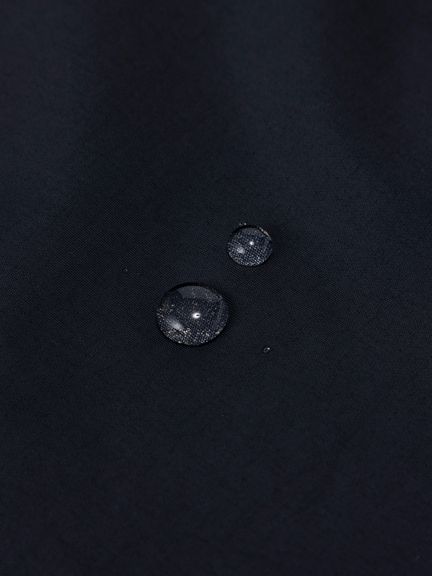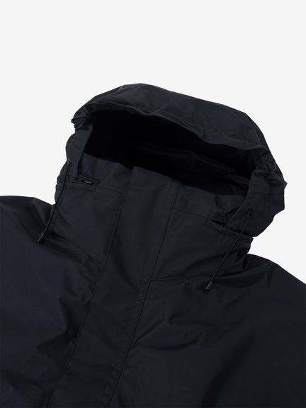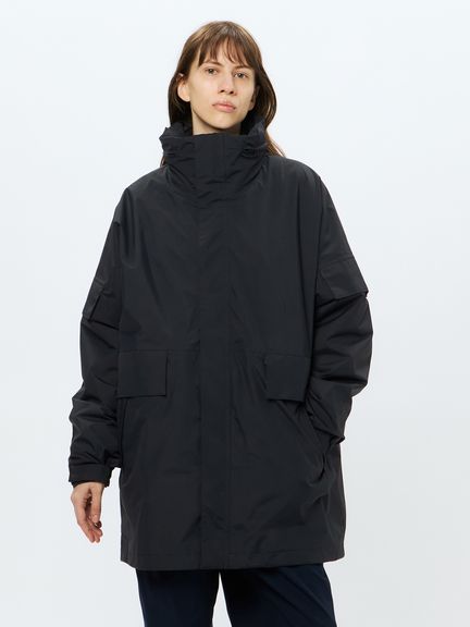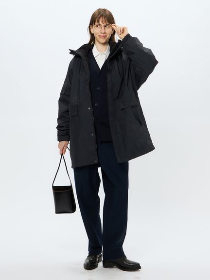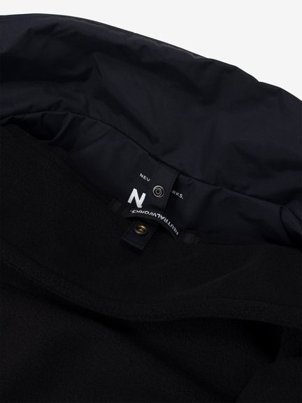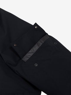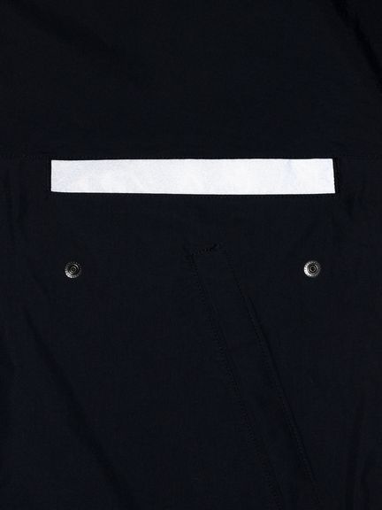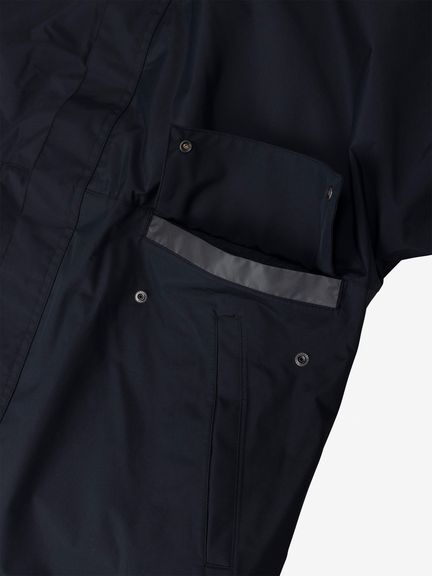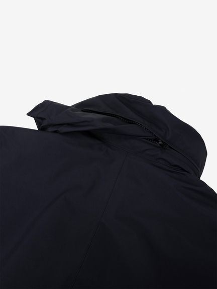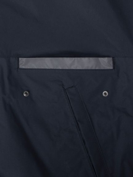 アウターははっ水加工を施したナイロン2層構造、スタンドカラーのインナーは保温性と通気性を兼ね備えたフリース素材を採用。アウターとインナーはファスナーで連結ができ、それぞれを単体で着用することもできます。アウターの袖はゆったりとしたドルマンスリーブ。両腰、両袖にフラップポケットが付き、フラップを収納することでリフレクトパーツが現れ、夜間の視認性も考慮。サイドから手を入れることも可能な玉縁ポケットもあり、操作性に優れています。インナーのポケットの袋布は起毛メッシュを使用し、通気がありつつ手を入れたときのあたたかさも配慮。アウターのフードはビルトイン仕様。収納したときの形の美しさも考慮したデザインです。