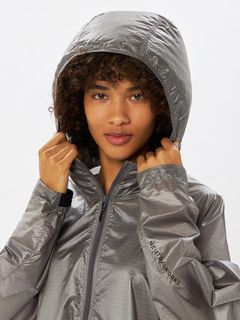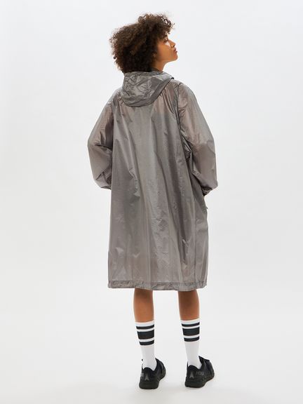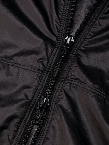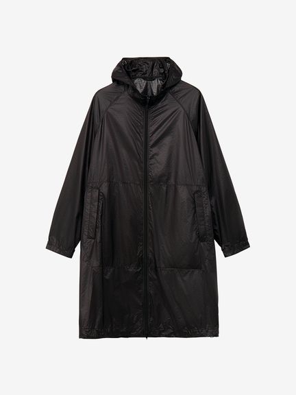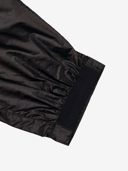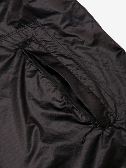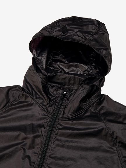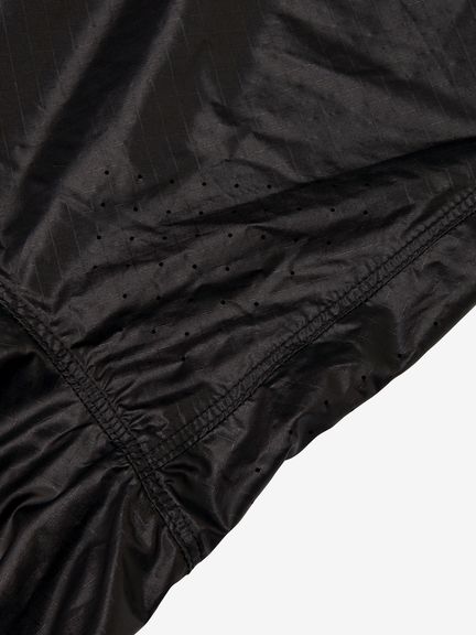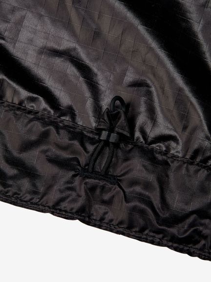 適度な光沢とシボ感のある素材は、軽量ではっ水性に優れています。ダイヤモンド型をした断面の糸を高密度に織ることで、摩擦に強く細かい引っかき傷が起こりにくいため、耐久性に優れているのも魅力です。脇下にベンチレーションホールがあり、衣服内のムレを効率的に排出。裾のドローコードでシルエットの調節が可能です。袖口はフィット感を考慮したゴム仕様。両サイドのポケットは、袋布にレーザーホールを入れることで通気性に配慮しています。