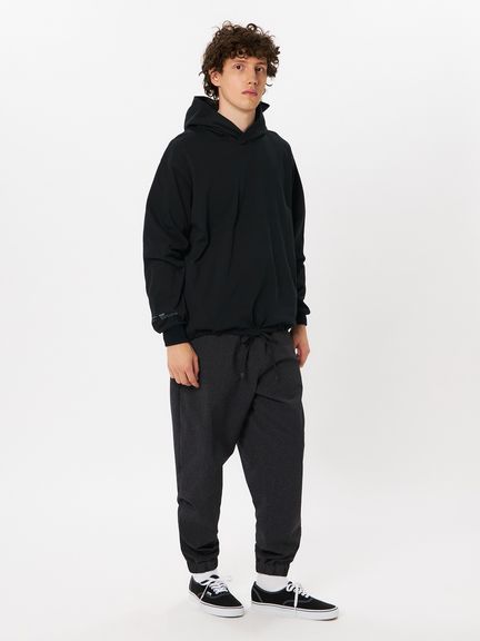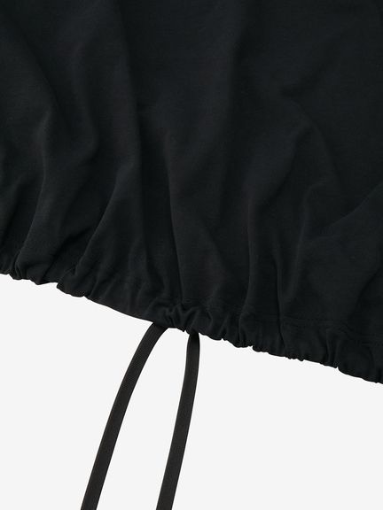 動きやすいゆったりとした素材感で、ドローコードで裾のシルエットが調整可能。
