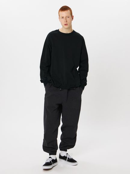 動きやすいゆったりとした素材感で、ドローコードで裾のシルエットが調整可能。