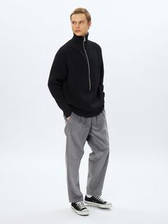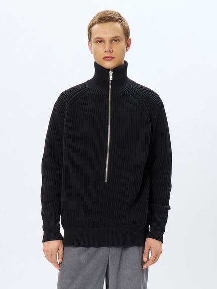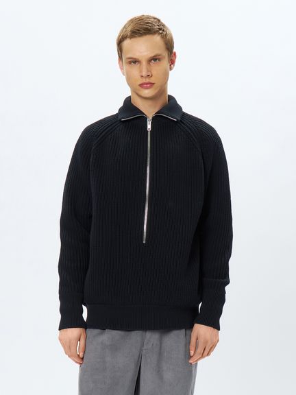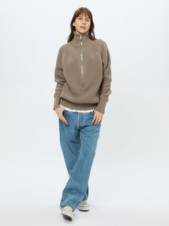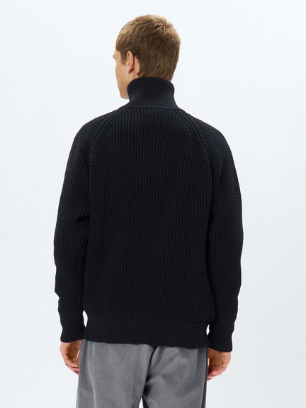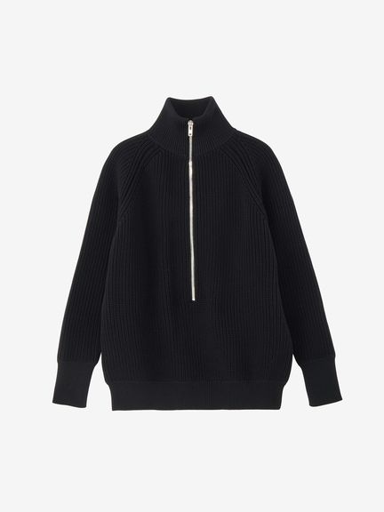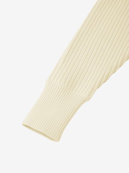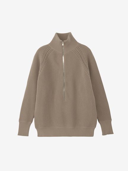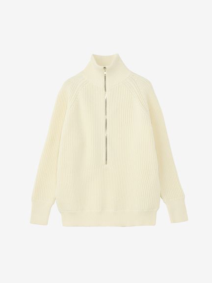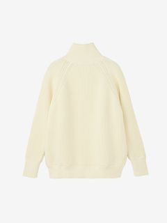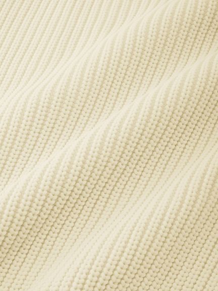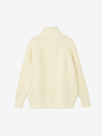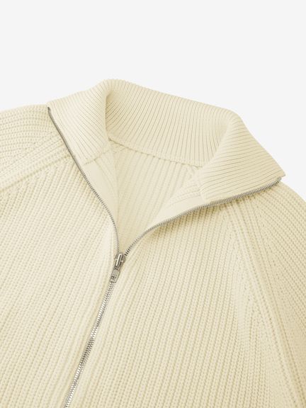 ポリエステル素材のニット生地は、かさ高がありつつ、ウールのニット素材よりも軽い着心地。自宅で手軽にお手入れが可能なイージーケア性も魅力です。肩に縫い目が干渉しにくいラグランスリーブで、ラグラン部分に配置したクラシカルな編み地が、デザインのアクセントになっています。フロントのファスナーは着脱のしやすさを考慮して長めに設計。光沢感のある金属ファスナーを使用し、上品な印象に仕上げています。