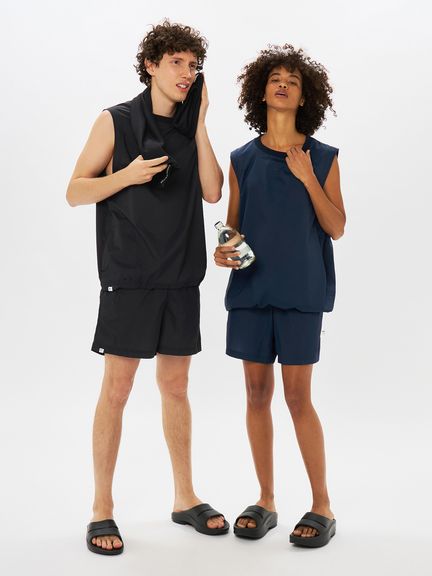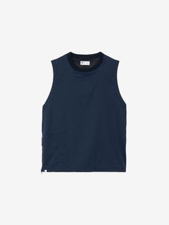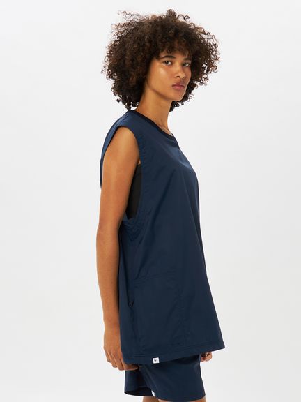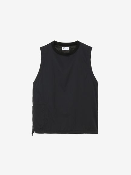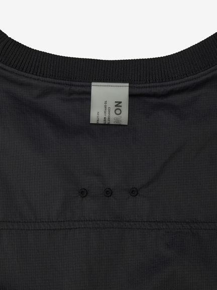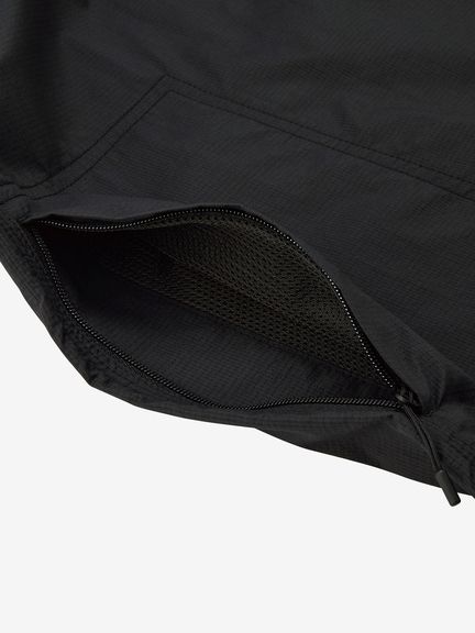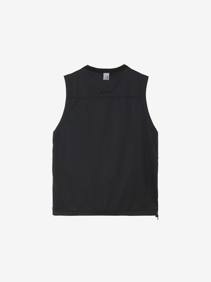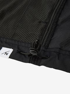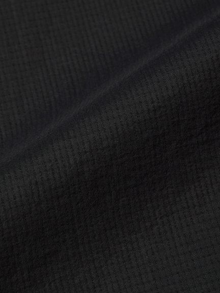 軽量ナイロン素材を採用。二重織構造で肌面は凹凸があり水はけがよく、濡れたときも肌離れがよく快適な着心地です。適度なストレッチ性もあり、上半身の動きにスムーズに追従します。汗が溜まりやすい後ろヨーク部分にはメッシュの裏地でドライ感を追求。襟ぐりはフィット感のよいリブ仕様。肩や脇はトリプルステッチで強度を高めています。ゆったりめのアームホールは、脇にガゼットとベンチレーションの菊穴を配置。右サイドのファスナーポケットは小物類の収納に便利です。UVケア(UPF15-30、紫外線カット率85%以上)機能付き。