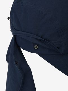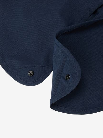 メッシュのような通気孔を持つ布帛素材は、さらりとした着心地。適度なストレッチ性で頭部にフィットします。UVガード(UPF30-50+、紫外線カット率90%以上)機能付き。生地に虫よけ加工を施しています。額に触れるスベリ部分の生地には、汗をかいても繊維の表面を弱酸性に保つ加工を施した糸を使用しています。首回りを覆うサンシェードパーツはドットボタンを留めて顔まわりを覆うこともでき、本体からの取り外しが可能。フロントのリフレクトロゴで、夜間の視認性を高めています。