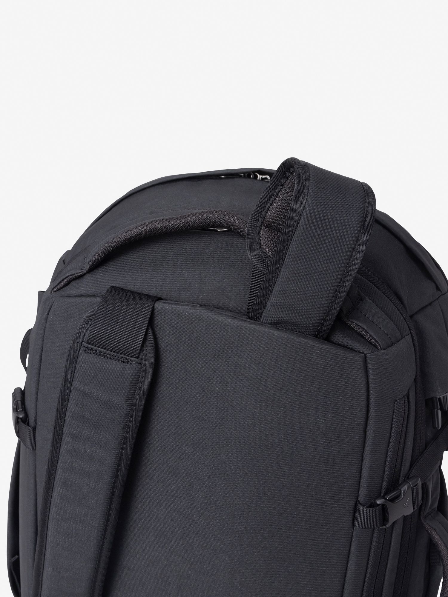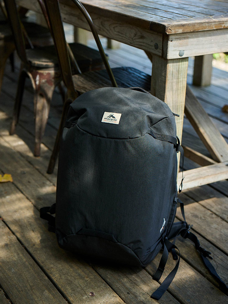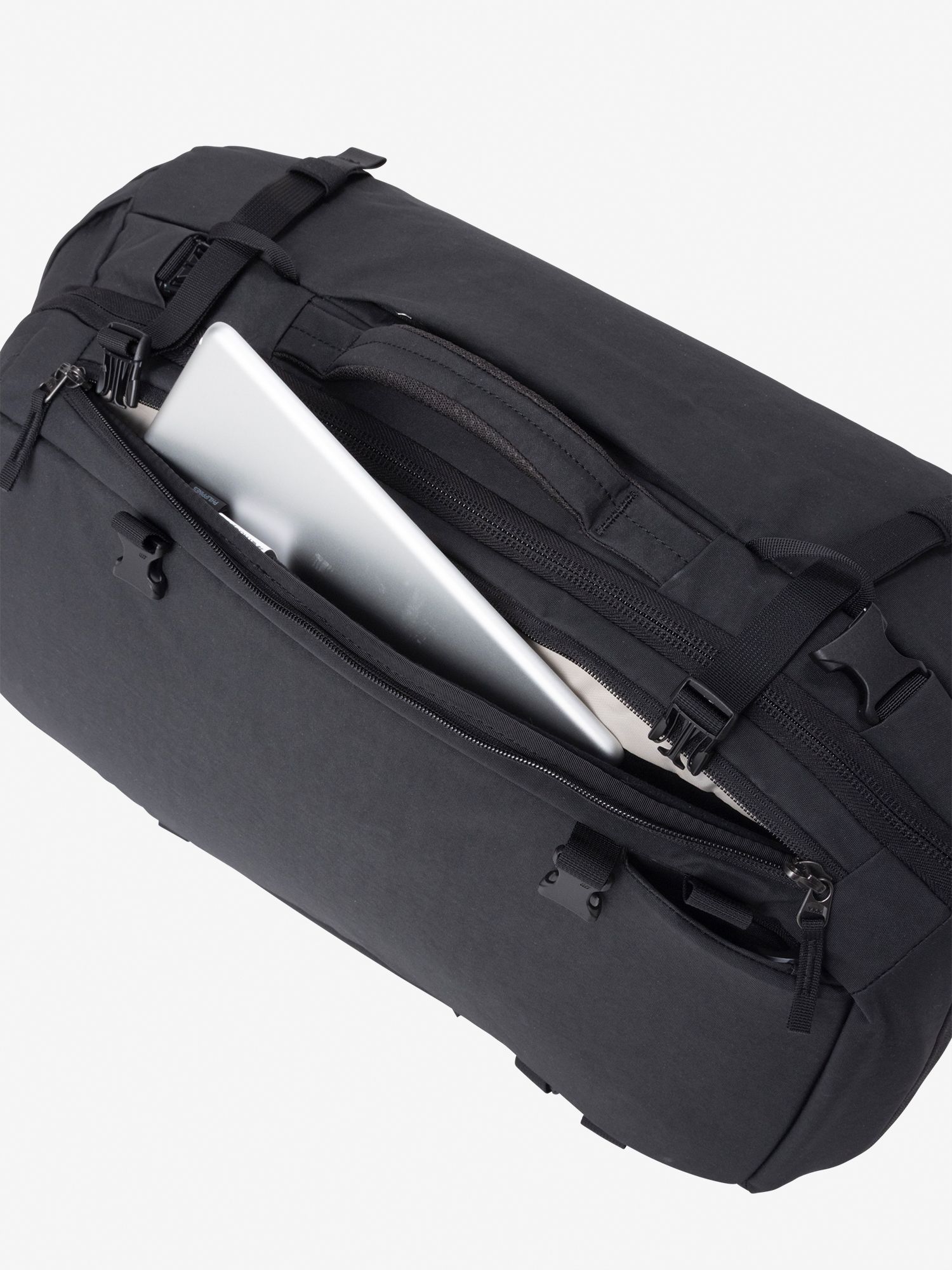 素材には、耐久性と耐水性を備えたリサイクルオックスフォードナイロンを採用。メインコンパートメントは、スーツケースのようにフラットに開くクラムシェル型の開閉式で、荷物をスムーズに収納できます。16インチまでのノートPC対応ラップトップスリーブ付き背面コンパートメントを装備。メインコンパートメントと背面コンパートメントには、セキュリティに配慮したロッカブルジッパ―を採用しています。トップのファスナーポケットは、クレジットカードなどのスキミングを防げるRFIDブロック機能付き。
