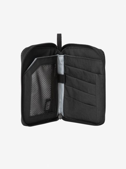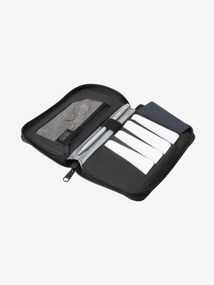 大きく開閉するジッパー付きの内部は、広げて横長でも使える設計で、左右にはカードスリーブやコインケース、ペンループなどを装備。