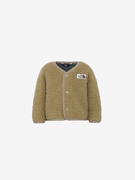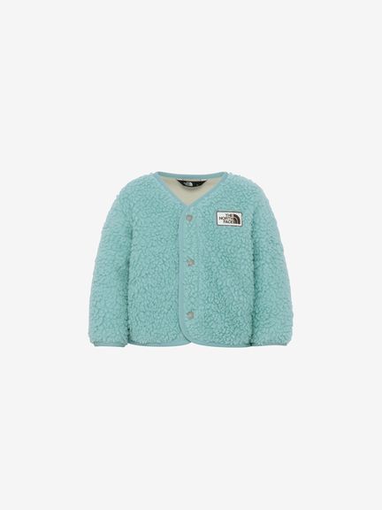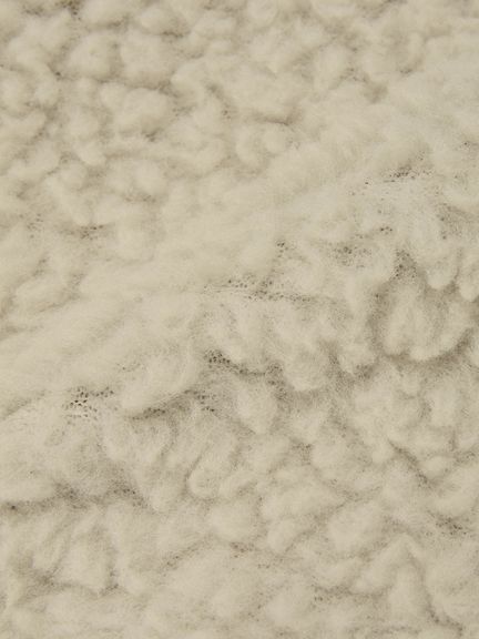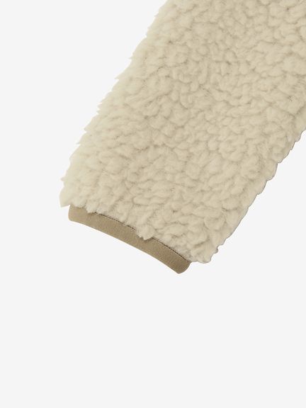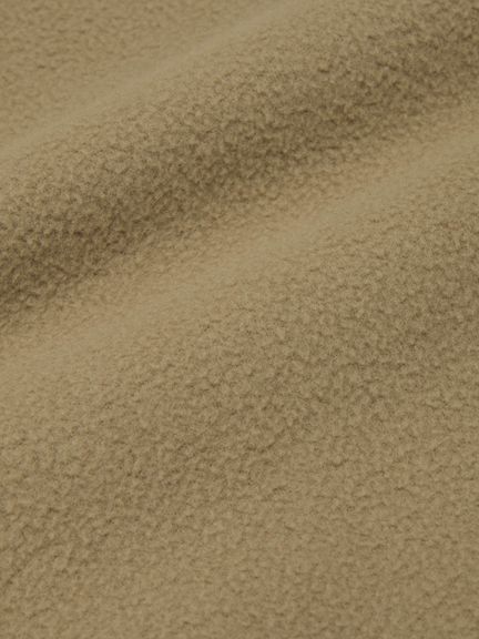 表面にはかさ高があり柔らかな毛足のボアフリース、肌面には滑らかな肌触りのマイクロフリースをボンディングした生地を採用しています。フロントはドットボタンで着脱がしやすく、袖口や裾、襟はすっきりとしたパイピング仕様です。