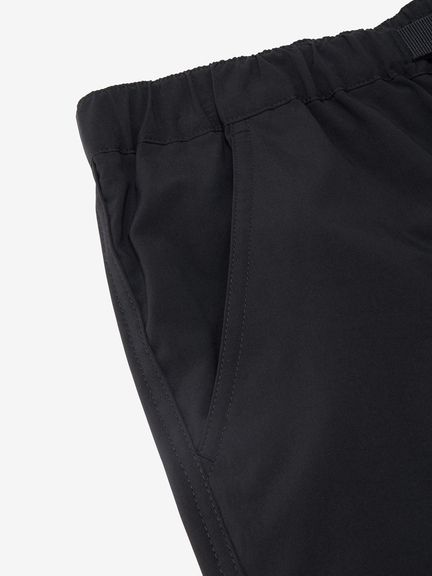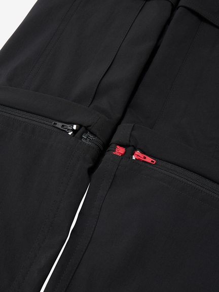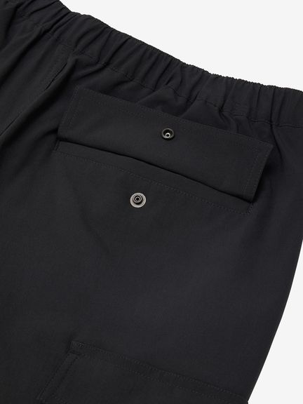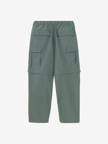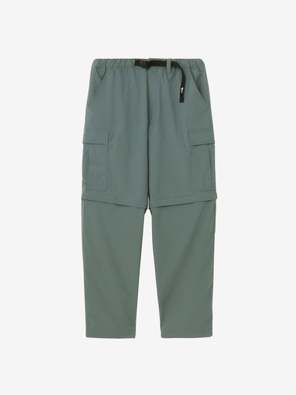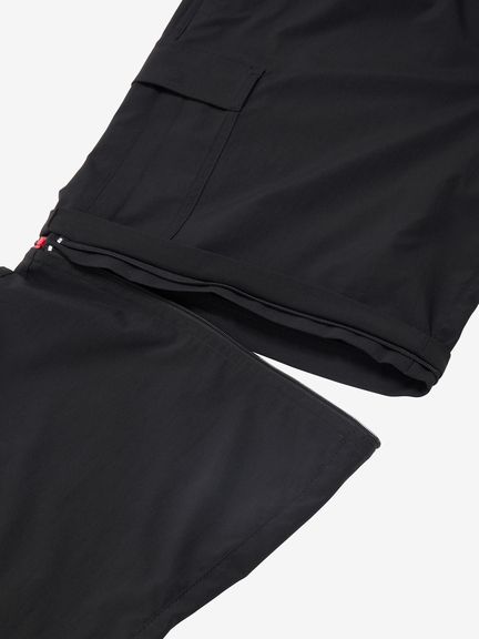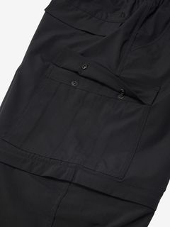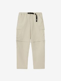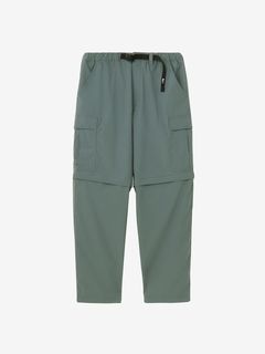 水場のキャンプシーンでも活躍する、コンバーチブルのカーゴパンツ。ポリエステルながら自然な風合いの生地はややストレッチ性があり、脚の動きにスムーズに追従。フッ素化合物を含まないはっ水剤を使用したはっ水加工を施しており、多少の雨にも対応します。ファスナーで着脱ができ、暑い日中やウォーターシーンではショーツ、肌寒い夜はロングパンツとして着用できるほか、ファスナーを途中まで開いてベンチレーションとして使うことも可能です。裾部分を分離しても左右が分かるように、ファスナーの引き手の色を分けています。両サイドに大容量のカーゴポケットを配置し、収納性も高めています。ウエストはウェビングベルト仕様。ややゆったりめのサイズ感で穿きやすく、タウンユースにも快適な1着です。