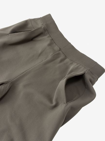 メインに採用したポリエステル素材のニット生地は、しなやかに伸縮して体の動きに追従。ウエスト背面と股下はメッシュ調の編地に切り替えて、運動中の衣服内のムレを排出します。両サイドと右後ろには小物の収納に便利なポケットを装備。UVプロテクト(UPF50+、紫外線カット率95%以上)付きで、強い日差しにも対応します。