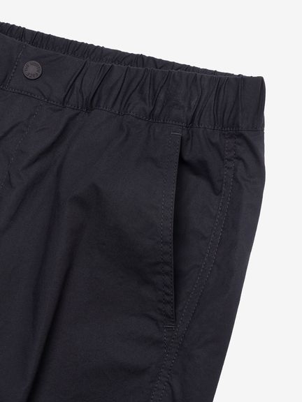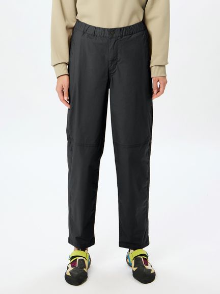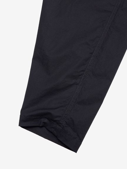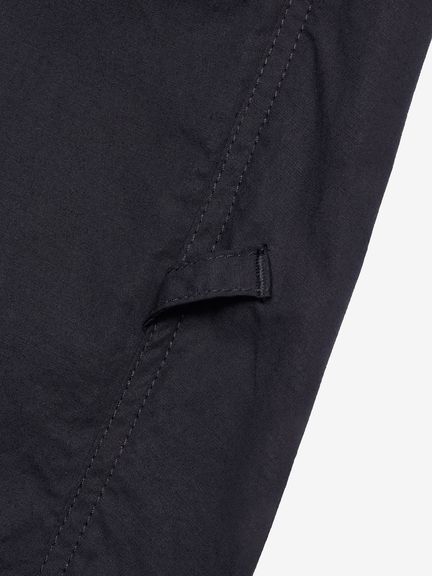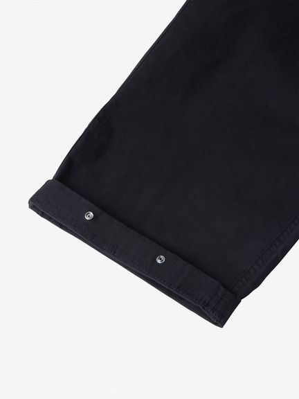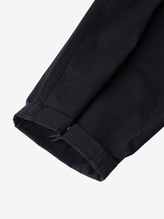 コットンにポリウレタンを混紡した生地は、天然素材のナチュラルさを持ちつつ、適度なストレッチ性で動きやすさを向上。ハイステップ時に最も伸びが必要となる内股に縫い目を入れない設計により、クライミングのダイナミックなムーブにスムーズに追従します。ワイドシルエットながら、裾のスナップボタンで裾幅を絞ることができ、足元の視界を妨げにくい仕様。左サイドにブラシホルダーを配置。