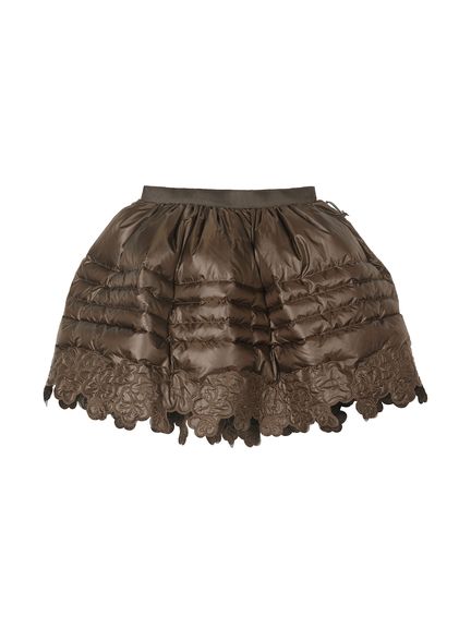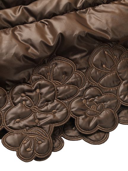 表地は薄手でしなやかなナイロン。中わたには800フィルパワーのダウンを封入しています。ウエストはコードロック付きウエストバンドでフィット感の調節が可能。裾はエレガントな花の刺繍をあしらい、女性らしさを演出しています。