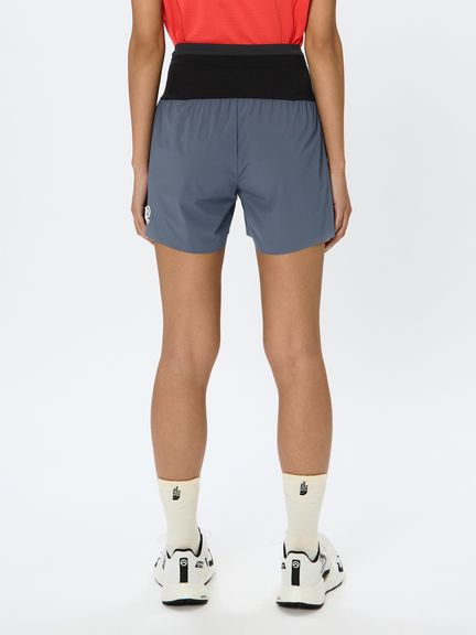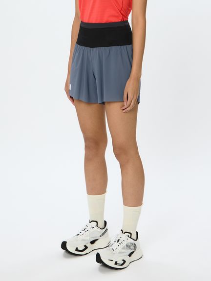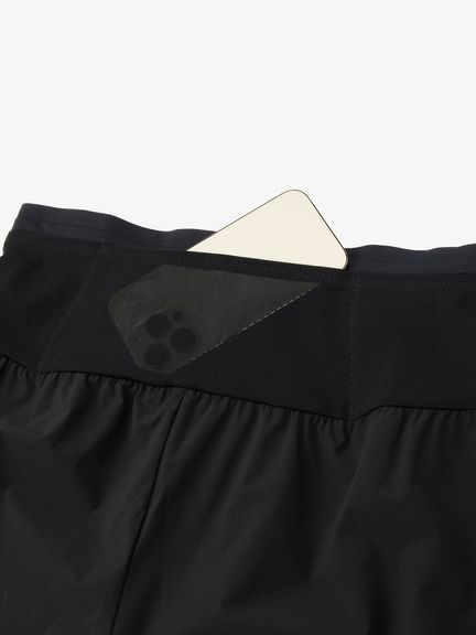 身生地には雨や霧などの影響を受けにくいはっ水加工を施した軽量ナイロン素材を採用。裾口は縫い目のないフリーカット仕様で、肌あたりが少なく軽快に脚上げできます。ウエストには高いストレッチ素材を使用した6つのポケットを配備。幅広い面で体にフィットさせて収納できるため、ジェルやエナジーバーなどの行動食や、スマートフォンなどの小物の揺れを抑えながら携行できます。