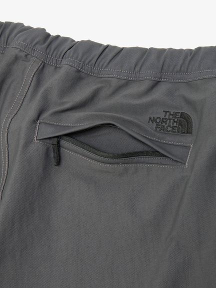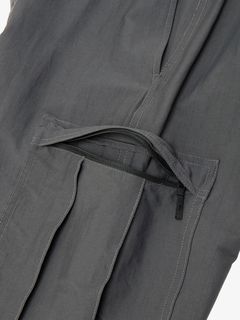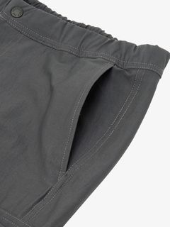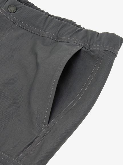 ナイロンとポリウレタンのツイル素材はストレッチ性が高く、適度な厚みがありながら動きやすい生地。左右に大きなカーゴポケット、さらに両ももと右ヒップにもファスナーポケットを配置し、収納力を高めています。ウエストはサイズ調整のしやすいスピンドル仕様。