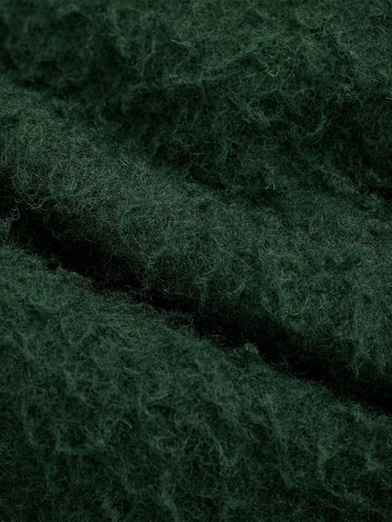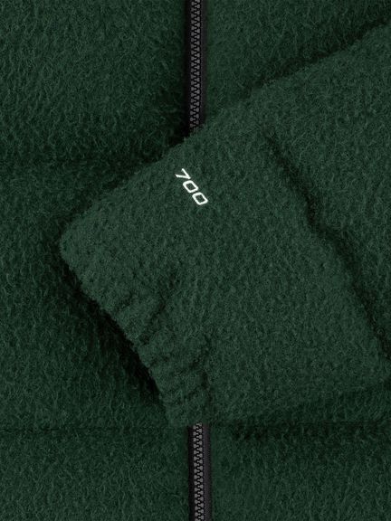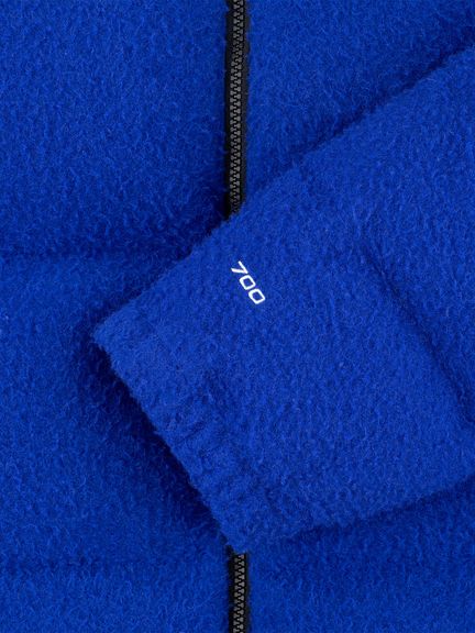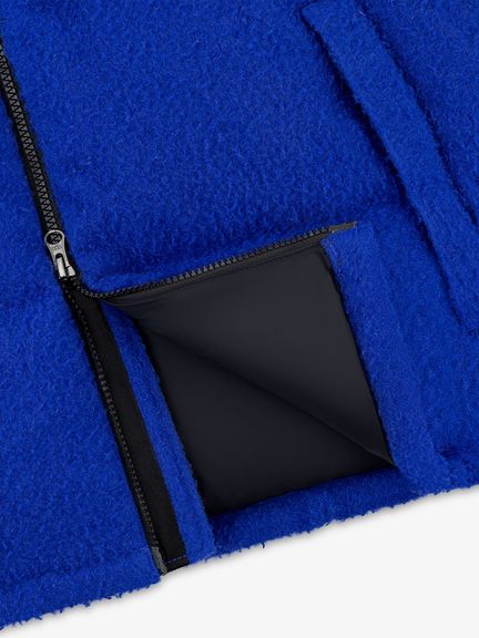 表地にはカセンティーノウールを採用。ウールならではの風合いと温かみが特徴です。中わたにはダウンを封入しています。フロントはダブルファスナーで、ダブルネームロゴのコラボファスナー付き。左右のファスナーポケットで収納性を高めています。