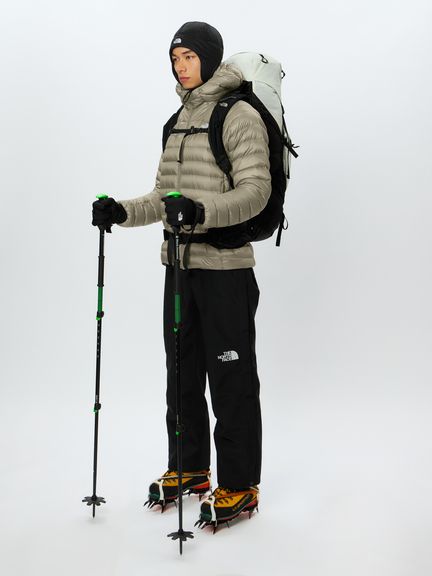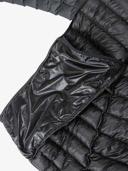 表地には漁網リサイクル糸を一部使用した、薄くしなやかなナイロン素材を採用。はっ水加工を施し、多少の雨や雪に対応します。インサレーションは不純物を可能な限り取り除き、高水準のかさ高性と保温性を持つクリーンダウン。ダウンにはっ水加工を施すことで、濡れてもかさ高が失われにくく、温かさを保つことができます。左右にファスナー付きポケットを配置。フードはヘルメット対応です。コンパクトに収納でき、携行に便利なスタッフサック付き。