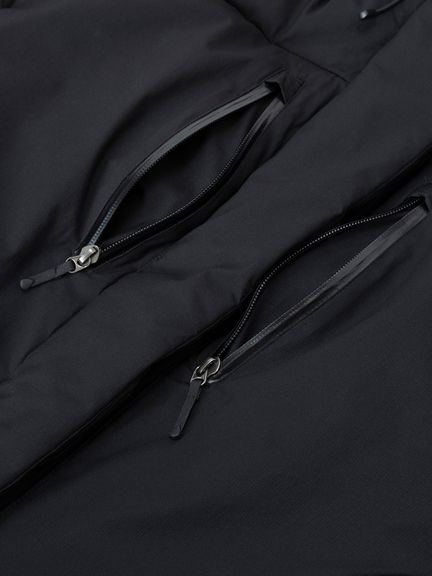 - フロントダブルフラップ仕様/内側に二つボトルポケット/ワンハンドアジャスターフーデッド/両胸ポケット止水ファスナー/ダウン入り内衿仕様