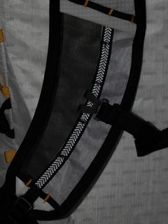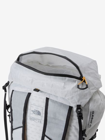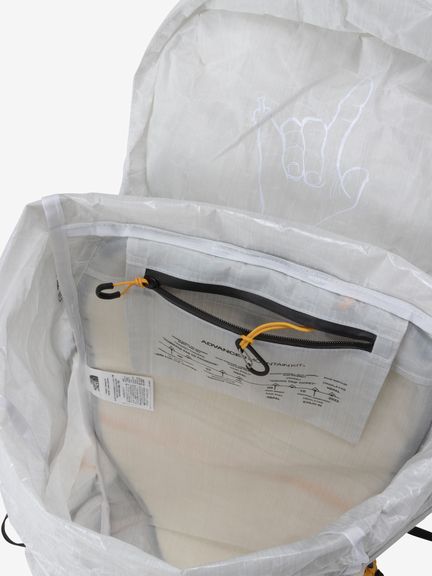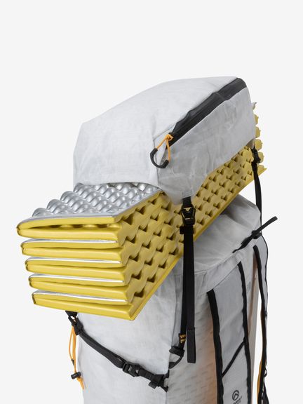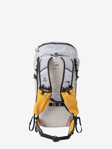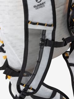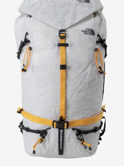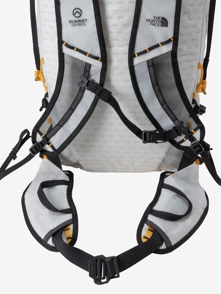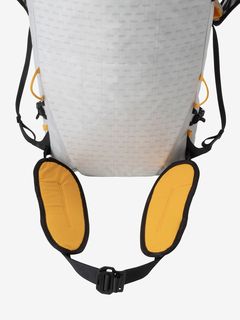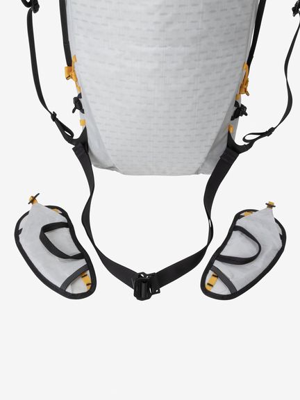 本体と雨蓋の素材には、軽量で耐久性が高い「Dyneema Composite Fabric」を採用。雨蓋は取り外し可能で、ロールトップ式クロージャーとしても使用できる2WAY仕様です。ショルダーハーネスには、保水しにくいモノメッシュを採用。ヒップハーネスは上下に位置調整ができ、取り外してクライミングハーネスの干渉を軽減することも可能です。