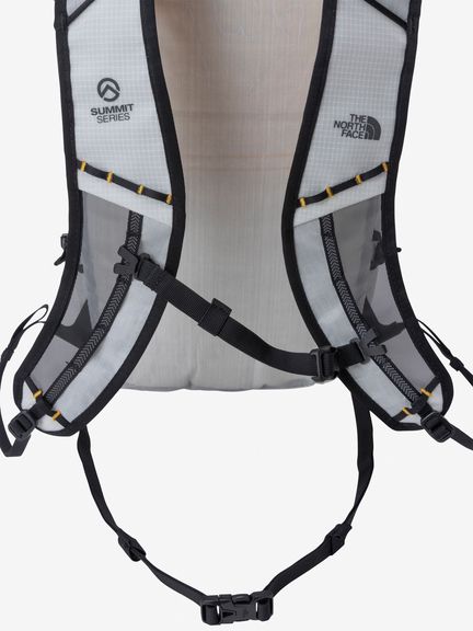 メイン素材には、軽量で耐久性が高い「Dyneema Composite Fabric」を採用。メインコンパートメントはロールトップ式クロージャーで、山行スタイルに合わせて容量の調整ができます。ショルダーハーネスには、保水しにくいモノメッシュを採用。