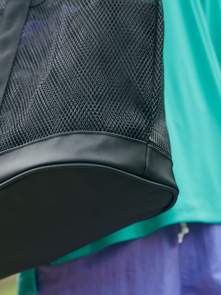 メイン素材は、水抜けや通気性のいいTPEラミネートメッシュを採用しています。ボトム素材には、外側と内側にコーティングを施して、高い耐水性と耐久性を備えた1000デニールのTPEファブリックラミネート(リサイクルポリエステル100%)を採用し、お手入れもしやすい仕様。容量は44リットルで、外側に3つ、内側に1つのポケットを備えた十分な収納力です。