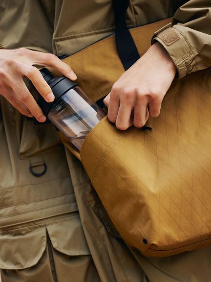トップのポケットは電車内など前に抱える状況や肩掛け時での小物の出し入れを快適にします。また、大きな二つのサイドポケットはボトルや折り畳み傘などの収納に適しています。軽量性と耐久性両方優れるX-PACの生地を使用しています。