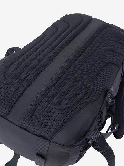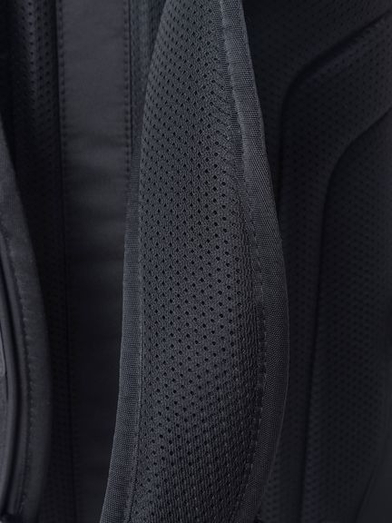 背面は、背骨のラインに沿ってクリアランスを確保するスパインチャンネル構造を採用。エアメッシュとPEシートの立体構造により通気性を高め、背負い心地を快適に保ちます。