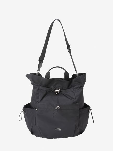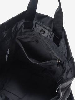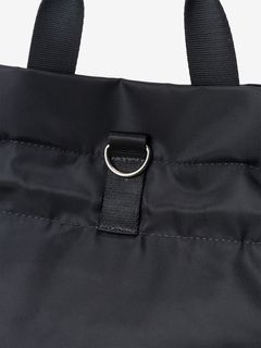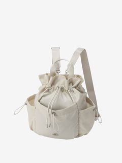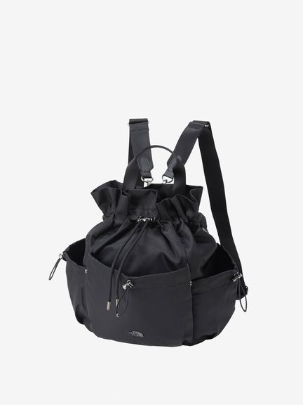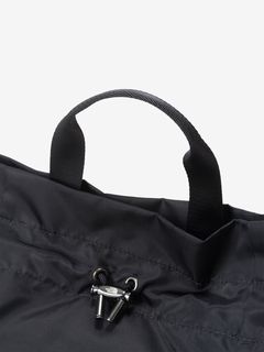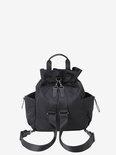 表地はツヤのあるナイロン素材を採用し、メタル素材のロゴを配置して、洗練された上品さを演出。袋の口を紐で絞って開閉する巾着タイプです。ストラップを掛け替えることでバックパックにもショルダーバッグにもなる2WAY仕様で、様々なスタイルのコーディネートに合わせられます。