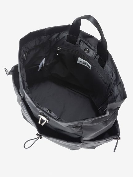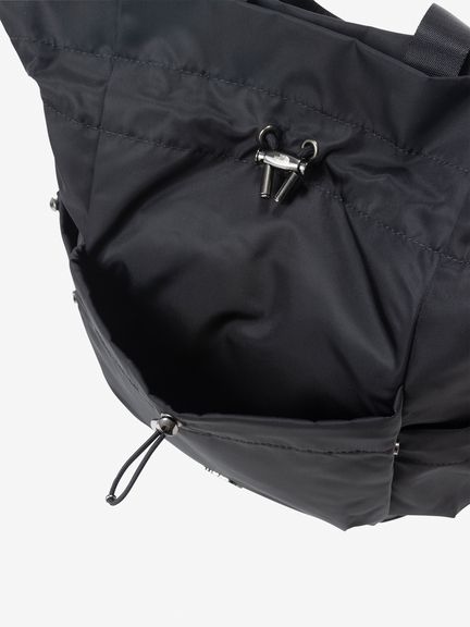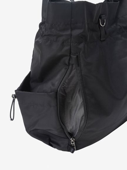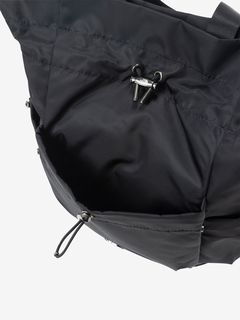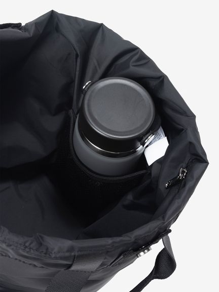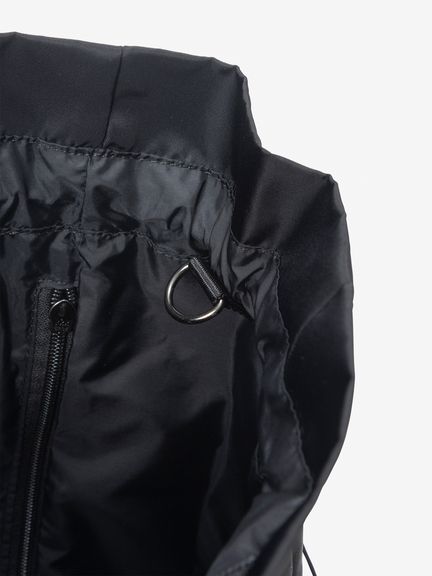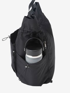 ドローコードで開閉できるシャーリングポケットをフロントと両サイドに備え、小物の収納に便利。メイン気室内にはファスナー付きポケットやボトルなどを収納できるメッシュポケットを装備。背面にはメイン気室にアクセスできるファスナーオープニングがあり、荷物をスムーズに取り出せます。