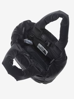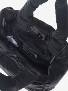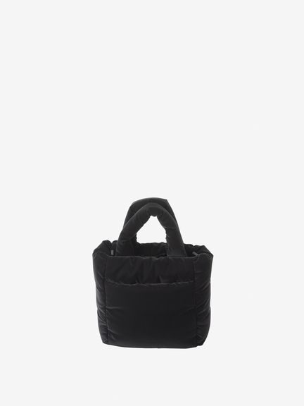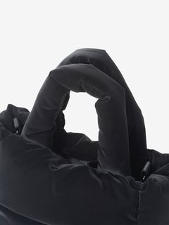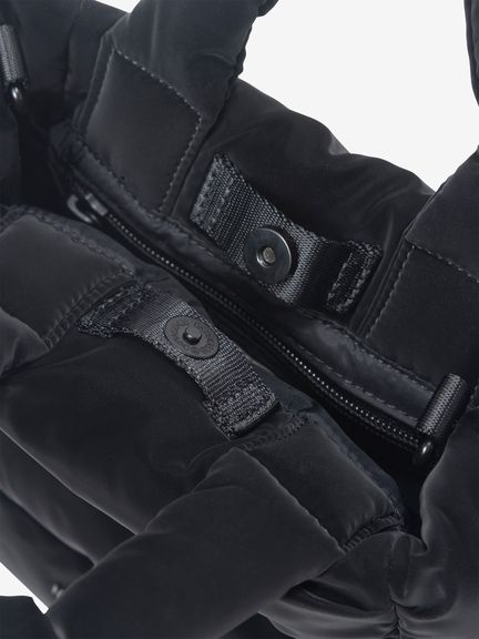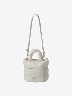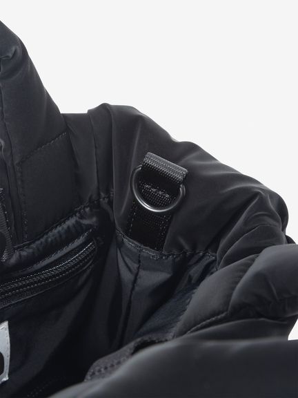 ツヤのあるナイロン生地にパッド素材を入れ、軽やかさと温かみのある立体的なシルエットです。メタル素材のロゴを配置して、洗練された上品さを演出。ハンドル部分にもパッド素材を封入して、持ちやすさを高めています。ショルダーストラップは取り外し可能です。