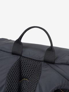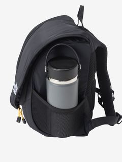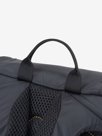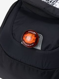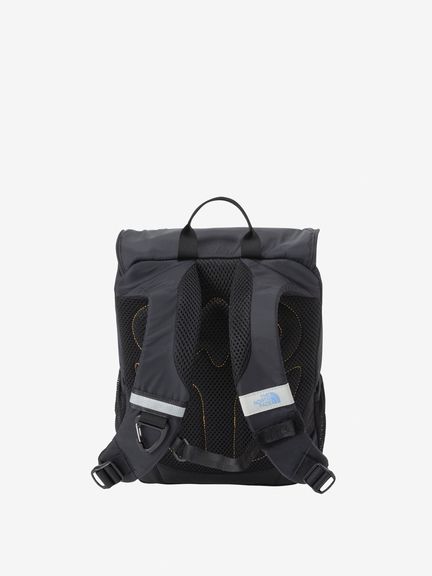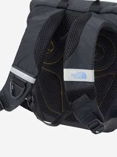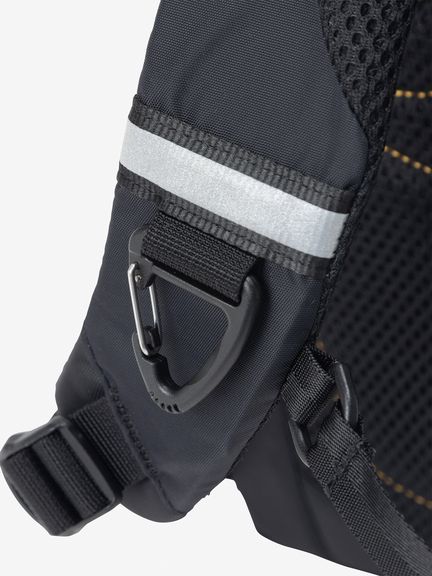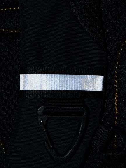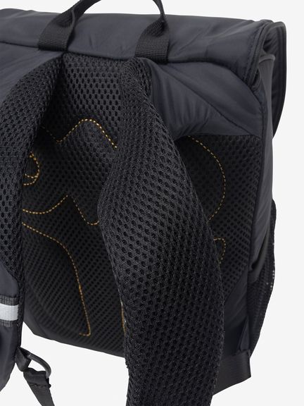 メイン生地にはリサイクル100%素材を採用して、環境にも配慮。本体周辺はパイピング仕様で、パック形状をきれいにキープできます。サイドには小物の収納に便利なメッシュポケットを設けて、本体内側にはネームホルダーポケットを配置。本体とショルダーハーネスにはリフレクターを付けて、夜間の視認性を高めています。