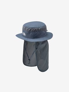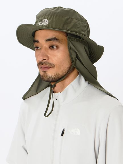 スナップボタンで簡単に取り外しができるシールド部は、首まわりの日焼け対策に効果的。あご紐は取り外し式。後部のアジャスターコードにより頭まわりのフィット感の調節が可能です。UVケア(UPF15-30、紫外線カット率85%以上)機能付きで、日差しが強い春の残雪期から秋まで幅広いシーズンに活用できます。