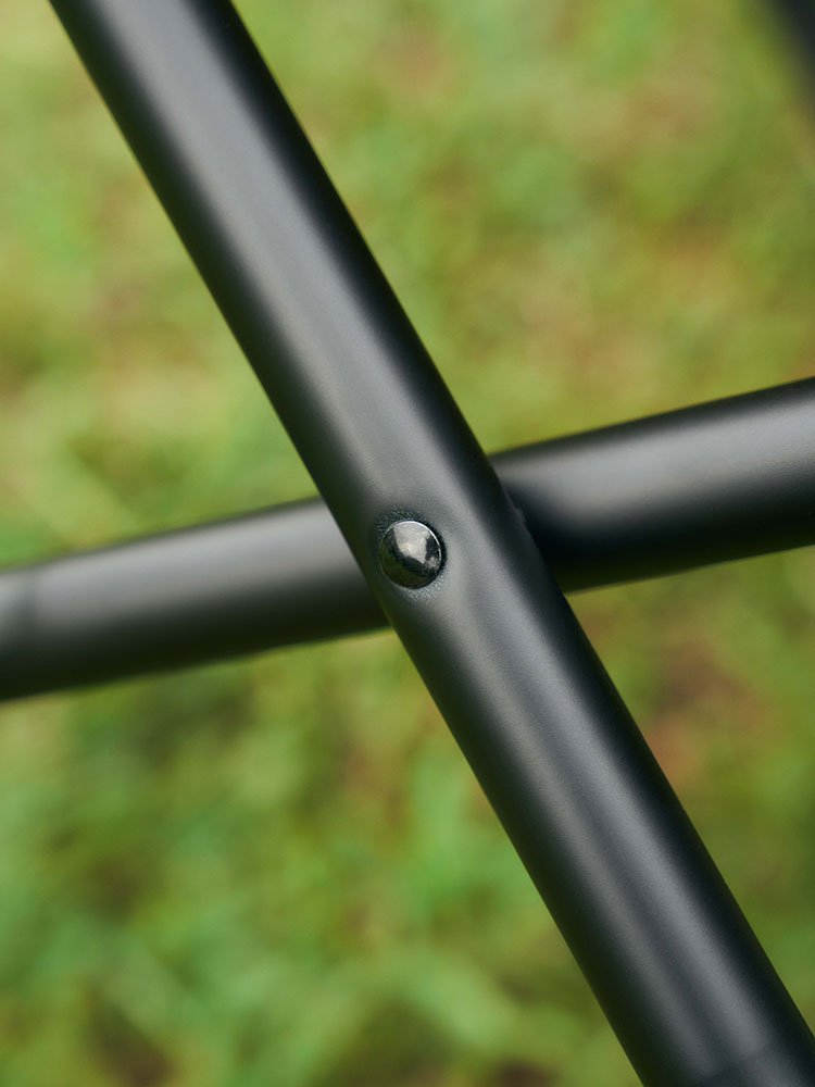 耐腐食性と耐摩耗性に優れるアルマイト処理を施した軽量なアルミフレームを採用。ファブリックには、1680デニールの高強度なコーデュラバリスティックを使用。サイドフレームを体に合わせて曲げることで、肌とフレームの干渉を軽減し、優れた座り心地を実現しています。