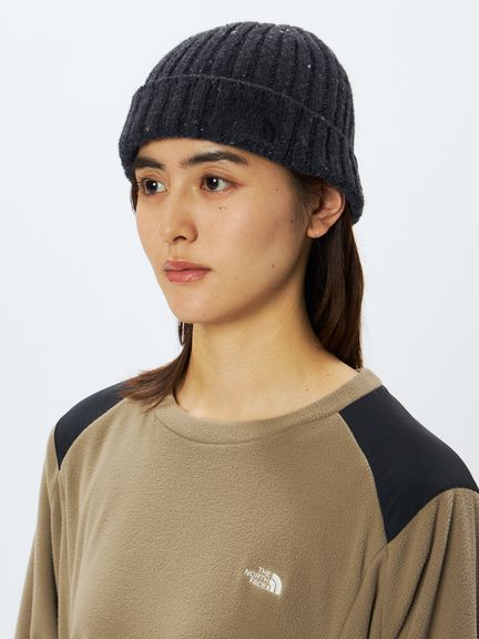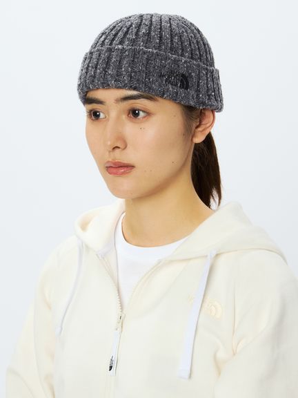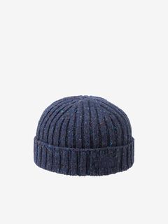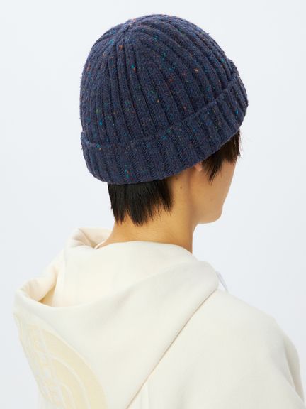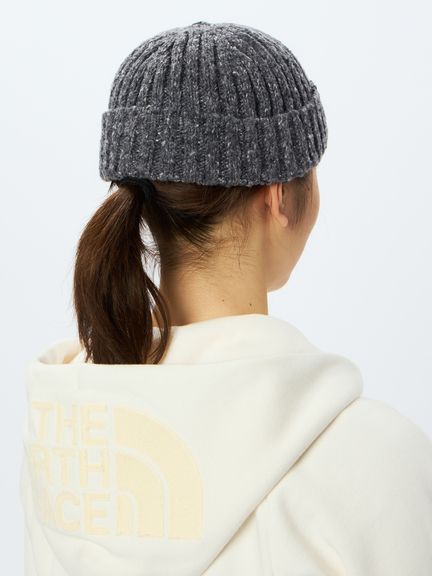 高級感のあるネップ糸を使用。横方向に伸縮するリブ編みで、頭の形に心地よくフィット。ほどよい太さの編み目が、上品かつカジュアルな雰囲気を演出しています。折り返し部分には生地と同色の刺繍ロゴを配置。