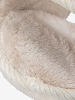 ふんわりとした毛足の長いポリエステルのマイクロフリース素材を採用し、内側にはソフトなフェイクファーを使用しています。コーデュロイ素材のバインディングが耐久性を高めるとともに、デザインのアクセントになっています。内側のアジャスターにより長さの調節が可能です。