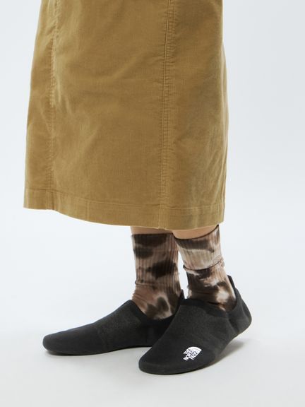 トラベルシーンやキャンプなど多様なシーンで活躍するルームソックスです。スリッパとソックスを融合したような立体的フォルムで、素足でもソックスを履いた状態でもゆとりを持って快適に履けます。足裏には滑り止めのシリコンプリントを加工。コンパクトに折りたたんで付属の携行スタッフサックに収納でき、テントや山小屋、飛行機内での室内履きとしても活用できます。携行スタッフサックはランドリーバッグとしても使用でき、ご自宅で簡単に洗濯でき、清潔さをキープできます。