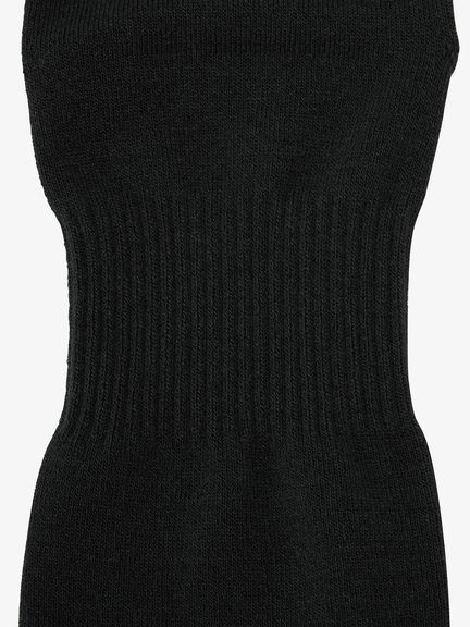 素材には、一般的なポリエステルより耐久性とストレッチ性が高いPBTとポリエステルをらせん状に紡績した素材を採用。通気性に優れ、シャリ感のある涼感な風合いの履き心地です。土踏まずのアーチサポート構造が走行時の負荷を軽減し、つま先とかかとはパイル仕様でクッション性を高めています。銀イオンによるポリジン・ステイフレッシュ加工の抗菌防臭性を装備。