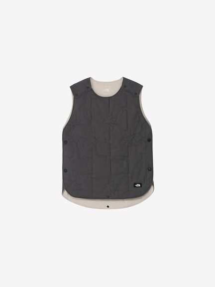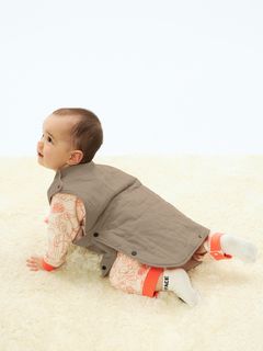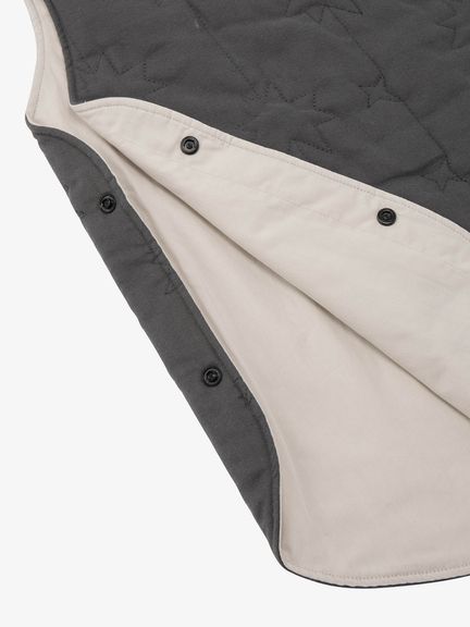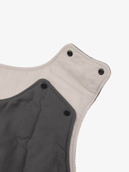 表地と裏地にはやわらかなオーガニックコットンを採用。中わたには、サステナブルを考慮したカポック混素材を採用。両肩と脇は着脱がしやすいドットボタン仕様です。