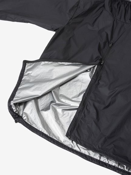 - 薄地チタンスパッタリング加工素材/パックの上から着用できるカバーオール仕様/フィット性を高めた小さめのフード設計/裾ドローコード仕様/フロントファスナー逆開仕様/リフレクターロゴ