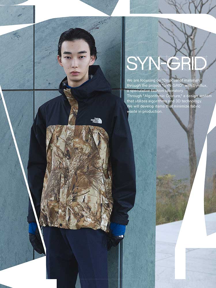 プロダクトに先端的なテクノロジーを導入し、資源量を抑える「SYN-GRID」によるパターンメイキングを採用しています。独自技術により、衣服の3Dデータを高精細に解析し、極小廃棄のパターンを再構築。従来のパターンとパーツ数はほぼ変わらず、縫い目の数も維持しながら、裁断による生地の廃棄率を約17%から約9%に軽減しています。素材には軽量なハイベント2.5層を採用。冷気を遮断しながら、高い防水透湿性も確保しています。フロントはダブルフラップ仕様です。