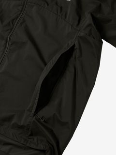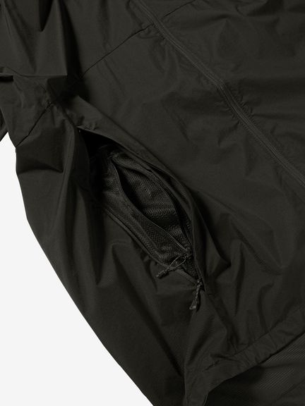 肌面はグリッド構造で、汗ばんだ肌が生地にまとわりつくことを軽減します。フードは片手でも調節が容易なワンハンドアジャスター仕様。メッシュポケットはベンチレーションを兼ねていて、右ポケット内部にセキュリティポケットがあります。フード裏のポケットに本体を収納できるパッカブル仕様。