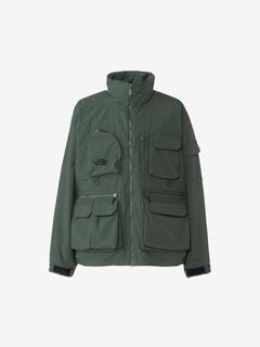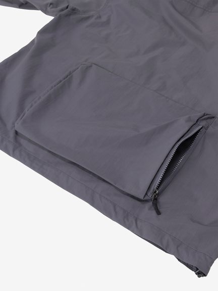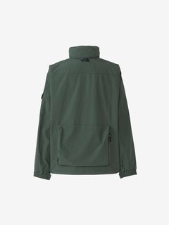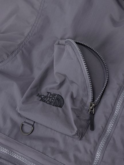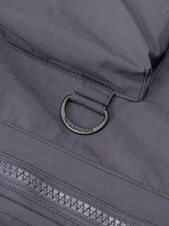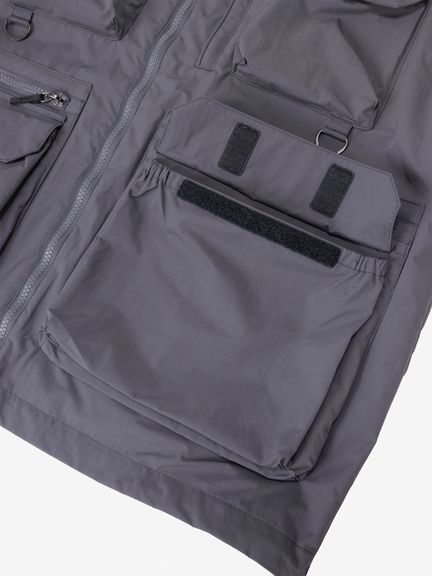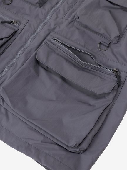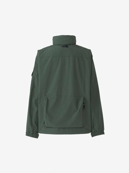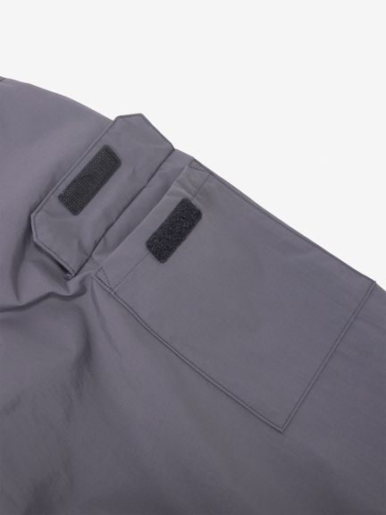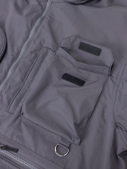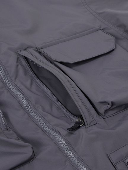 表地はコットンライクな表情のタスランナイロンを使用。フッ素化合物を含まないはっ水剤を使用したはっ水加工を施しており、多少の雨や汚れに対応します。裏地は肌離れのよいポリエステルメッシュ。大容量のマチ付きポケットは、中身が落ちにくいように面ファスナー式のフラップ付き。右胸のハーフドーム型ファスナーポケットは、貴重品の収納に便利です。背面にも大容量のマチ付きポケットを配置。襟にフードを収納できるビルトインフード仕様です。