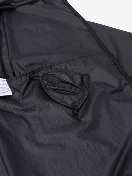 素材には、超薄手ながらも防風性に優れたナイロンのリップストップ生地を採用。裾や袖口はゴムシャーリング仕様で、バタつきを抑えます。超薄手の生地で継ぎ目を最小限にしたパターン設計を追求し、重量はわずか約50g(メンズLサイズ)。内側脇部分に取り付け可能な小型のスタッフサックに、コンパクトに収納できます。走りながらでも素早く収納できるようにスタッフサックの開口部は大きく開く仕様。